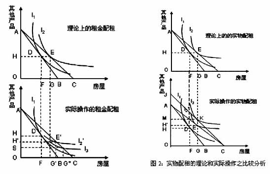 依據(jù)消費者效用理論的假設(shè),理論上的實物配租如圖2上圖所示,其消費者效用與租金配租結(jié)果相同,它可以在短期內(nèi)迅速解決低收入家庭的住房困難,使他們的居住條件達到政府期望的標準,補貼效果非常明顯。