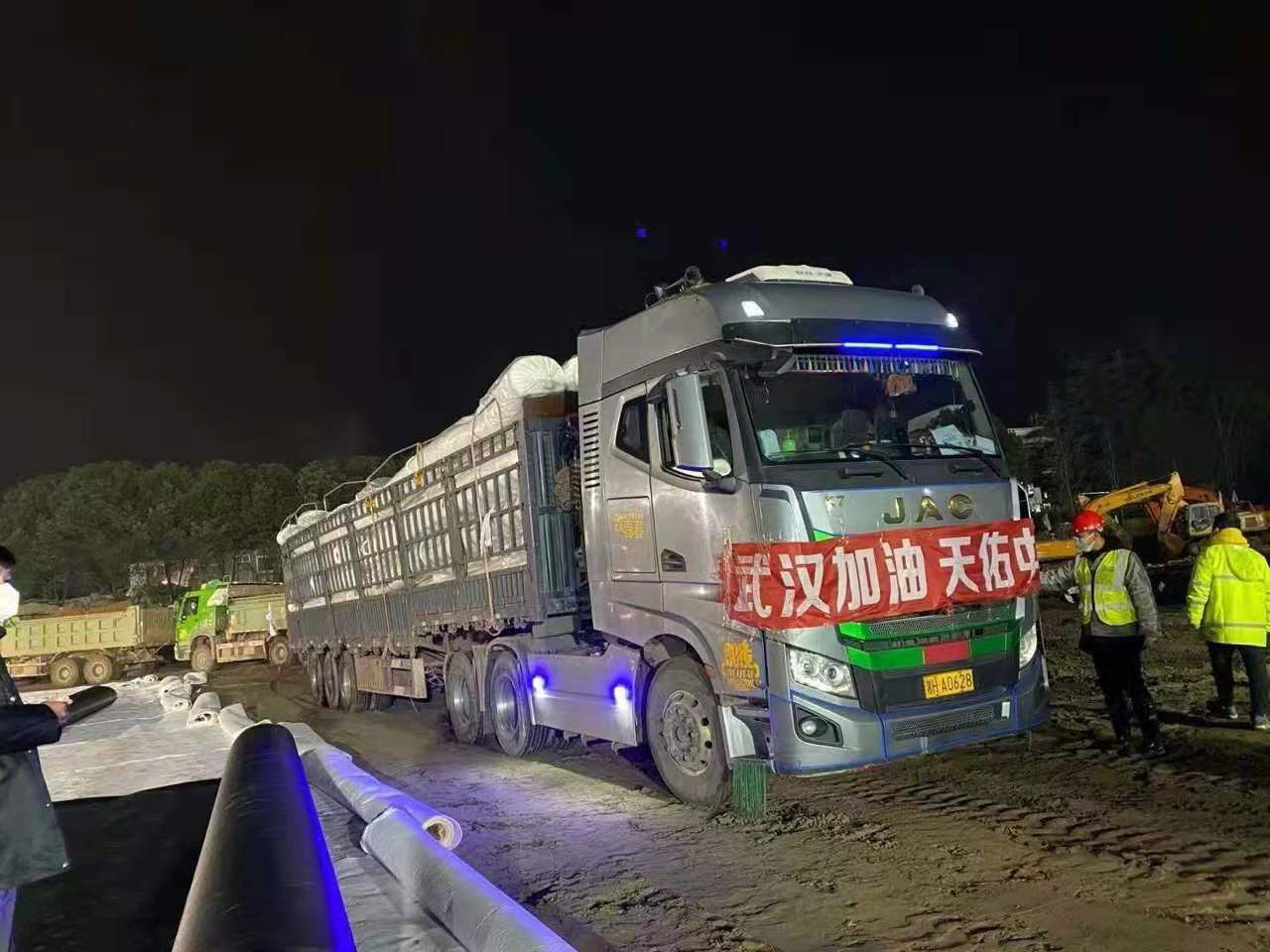 天鼎豐第一批4萬平米土工布于1月26日(大年初二)全部安全抵達武漢施工現場。第二批1.8萬平米土工布也于27日(大年初三)抵達現場。預計共有16萬平米土工布防護材料投入武漢火神山醫院建設。