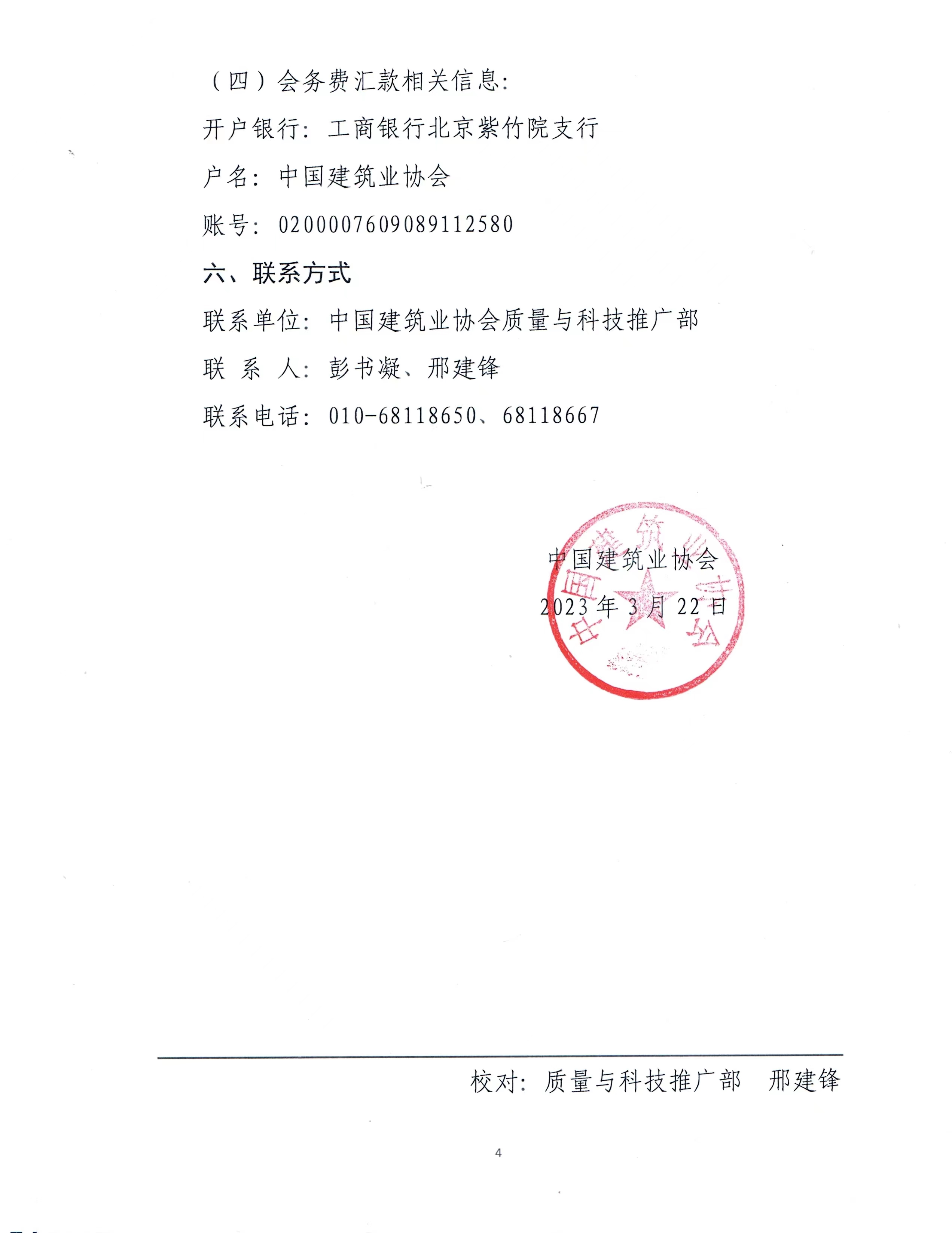 (三)可提前將會務費匯至中國建筑業協會銀行賬戶,匯款時請在“附言”欄目注明“提升+參會人員姓名”,我會將按反饋表中提供的信息開具增值稅專用(或普通)發票,請在報到時領取發票。也可在會議報到現場交會務費(發票會后郵寄)。
