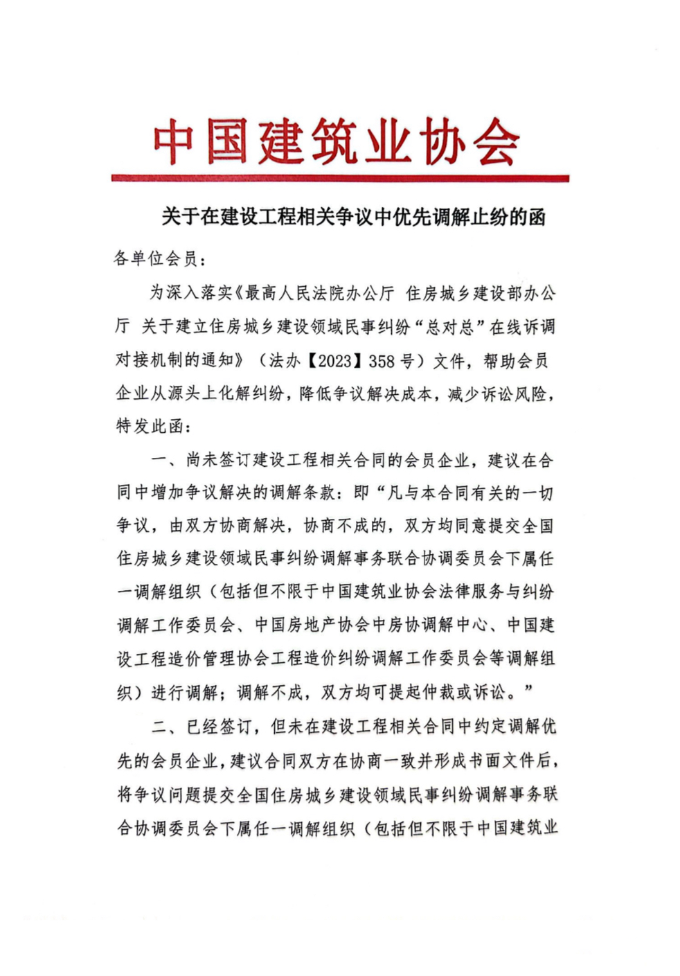 關于在建設工程相關爭議中優先調解止紛的函