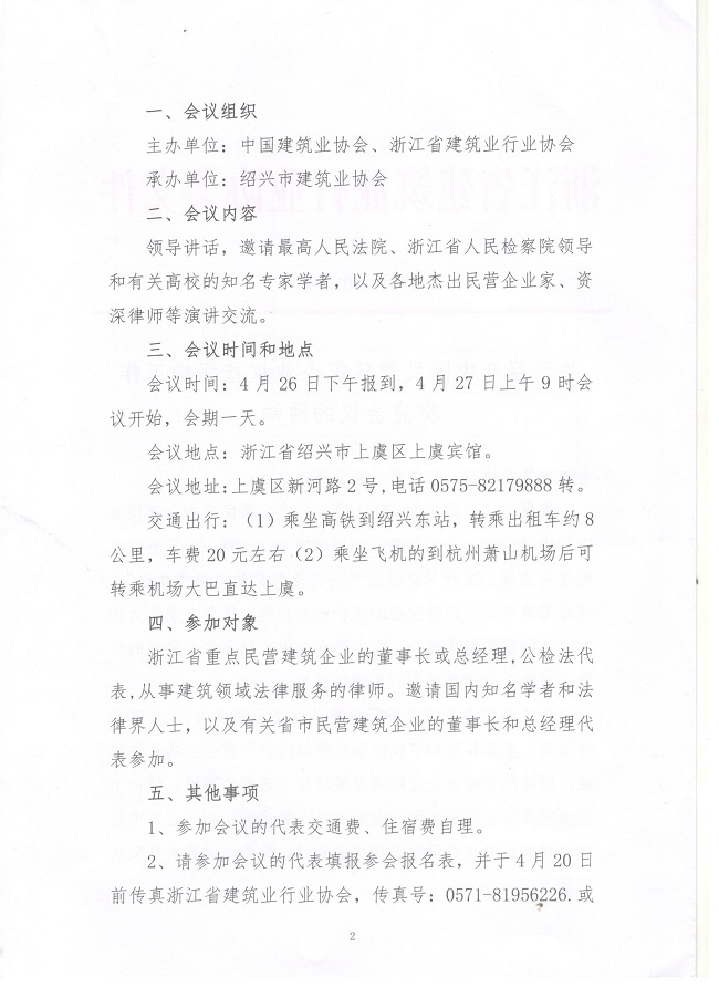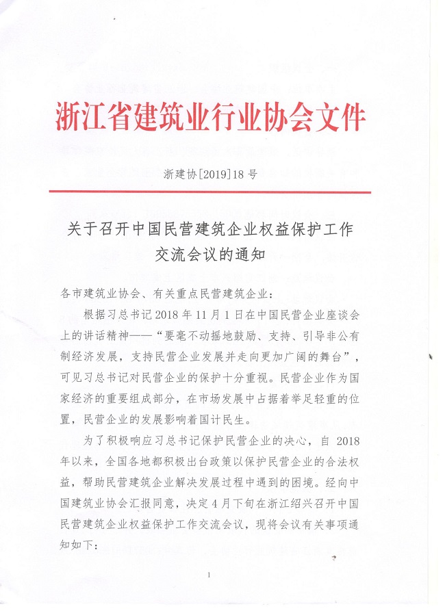 為全面貫徹習近平總書記在民營企業座談會上的重要講話精神,貫徹落實黨中央、國務院支持民營企業改革發展的決策部署,支持和推動民營建筑企業發展,我會決定與浙江省建筑業行業協會在浙江紹興聯合召開中國民營建筑企業權益保護工作交流會,深入研究民營建筑企業發展過程中遇到的困難和問題,切實維護企業合法權益,大力支持民營建筑企業發展壯大。請貴協會推薦本地區或本行業兩到三家民營企業參會(每家不超過2人)。會議安排詳見附件。