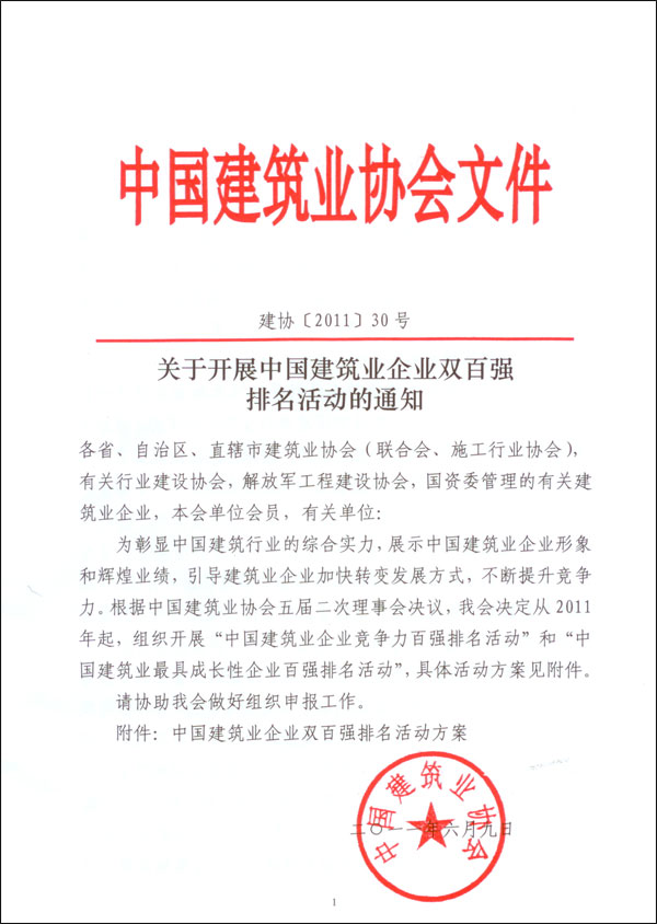 關(guān)于開展中國建筑業(yè)企業(yè)雙百強(qiáng)排名活動(dòng)的通知