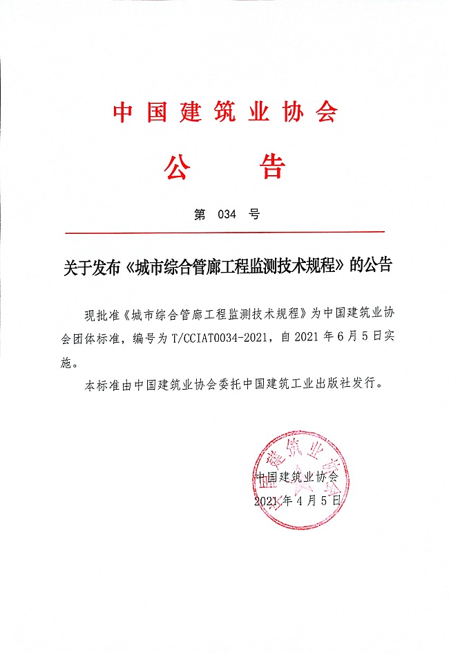 關于發布《城市綜合管廊工程監測技術規程》的公告