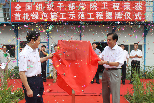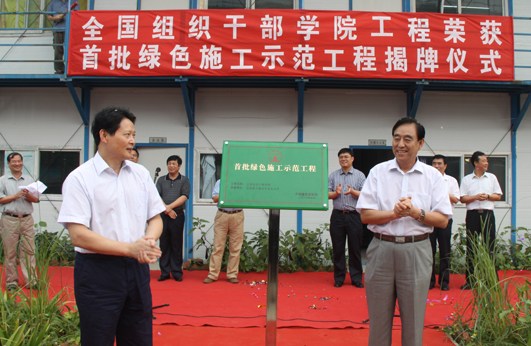 全國組織干部學院工程是中國建筑業協會確定的全國首批綠色施工示范工程之一。8月24日上午10時,在中國新興建設開發總公司一公司承建的該工程施工現場,舉行了隆重的揭牌儀式。中組部副部長李智勇、全國組織干部學院院長袁治平、中組部機關事務管理局副局長張忠、全國組織干部學院副院長劉亞軍、中國新興集團總經理于敦才、中國新興建設開發總公司總經理魏軍和一公司總經理賈玉斌等領導出席了儀式。儀式由全國組織干部學院工程基建辦主任鄭禮勤主持,李智勇部長、于敦才總經理為全國組織干部學院榮獲首批綠色施工示范工程揭牌。