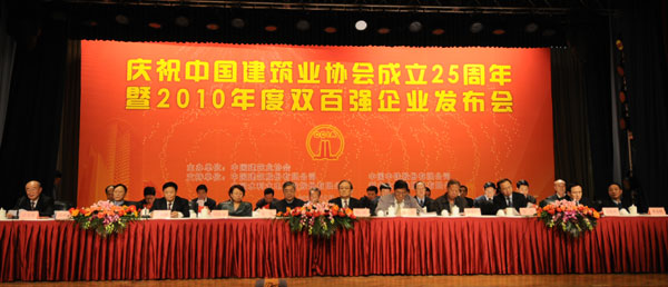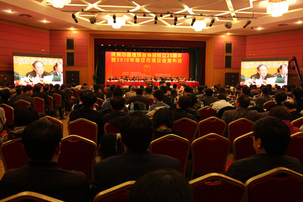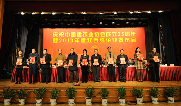 五湖四海,歡聚一堂。2011年12月14日,慶祝中國建筑業(yè)協(xié)會成立25周年暨2010年度中國建筑業(yè)企業(yè)雙百強發(fā)布會在京勝利召開。會上,隆重發(fā)布了中國建筑業(yè)企業(yè)競爭力百強和最具成長性百強(簡稱雙百強),并對79家建筑行業(yè)先進協(xié)會、81名建筑行業(yè)優(yōu)秀秘書長、206家全國建筑業(yè)先進企業(yè)、280名全國建筑業(yè)優(yōu)秀企業(yè)家進行了表彰。住房和城鄉(xiāng)建設(shè)部姜偉新部長特為大會發(fā)來賀信,中國建筑業(yè)協(xié)會鄭一軍會長出席并作重要講話。原建設(shè)部黨組成員、中國金屬結(jié)構(gòu)協(xié)會會長姚兵,住房和城鄉(xiāng)建設(shè)部總工程師陳重、科技委常務(wù)副主任李秉仁、建筑市場監(jiān)管司副司長劉曉艷,中國建筑業(yè)協(xié)會副會長易軍、李長進、范集湘、蔣志權(quán)、徐義屏、張魯風(fēng)、吳濤、欒德成、史殿臣、耿立新、李寶元、耿裕華、丘小廣、楊鏡璞、李里丁,中國安裝協(xié)會會長田世宇以及各地方建筑業(yè)協(xié)會、行業(yè)建設(shè)協(xié)會的有關(guān)領(lǐng)導(dǎo)和會員單位代表共600余人參會。