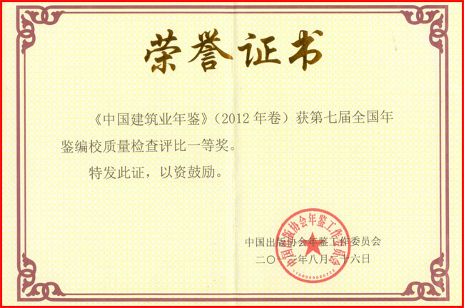 近日,中國出版協會年鑒工作委員會主辦的第七屆全國年鑒編校質量檢查評比結果揭曉。由住房城鄉建設部主管、我會主辦的《中國建筑業年鑒(2012年卷)》獲得一等獎。這是繼去年《中國建筑業年鑒(2011年卷)》榮獲第六屆全國年鑒編校質量檢查評比一等獎后,再次獲此獎項。
