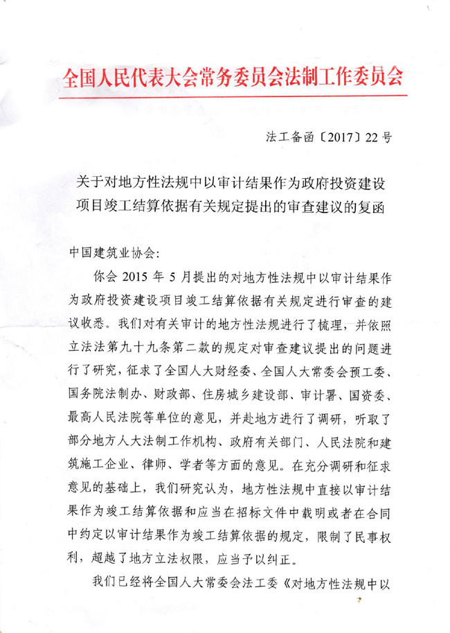 至此,我會聯(lián)合有關(guān)協(xié)會共同申請對規(guī)定“以審計結(jié)果作為工程竣工結(jié)算依據(jù)”的地方性法規(guī)進(jìn)行立法審查的工作取得了圓滿結(jié)果,有力維護(hù)了建筑業(yè)企業(yè)的合法權(quán)益。