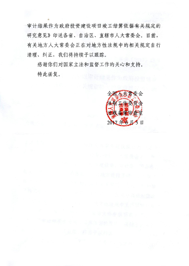 6月5日,我會收到法工委《關(guān)于對地方性法規(guī)中以審計結(jié)果作為政府投資建設(shè)項目竣工結(jié)算依據(jù)有關(guān)規(guī)定提出的審查建議的復(fù)函》。《復(fù)函》提出,在收到我會于2015年5月提交的《關(guān)于申請對規(guī)定“以審計結(jié)果作為建設(shè)工程竣工結(jié)算依據(jù)”的地方性法規(guī)進(jìn)行立法審查的函》后,法工委經(jīng)過充分調(diào)研和征求意見,認(rèn)為地方性法規(guī)中直接以審計結(jié)果作為竣工結(jié)算依據(jù)和應(yīng)當(dāng)在招標(biāo)文件中載明或者在合同中約定以審計結(jié)果作為竣工結(jié)算依據(jù)的規(guī)定,限制了民事權(quán)利,超越了地方立法權(quán)限,應(yīng)當(dāng)予以糾正。2月22日,法工委印發(fā)《對地方性法規(guī)中以審計結(jié)果作為政府投資建設(shè)項目竣工結(jié)算依據(jù)有關(guān)規(guī)定的研究意見》,要求各省、自治區(qū)、直轄市人大常委會對所制定或者批準(zhǔn)的與審計相關(guān)的地方性法規(guī)開展自查,對有關(guān)條款進(jìn)行清理糾正。6月13日,應(yīng)法工委邀請,我會有關(guān)負(fù)責(zé)同志赴法工委辦公室聽取了此項工作的開展過程和最新進(jìn)展情況,了解到各地現(xiàn)已完成自查,對相關(guān)條款的清理修訂工作亦在抓緊落實。