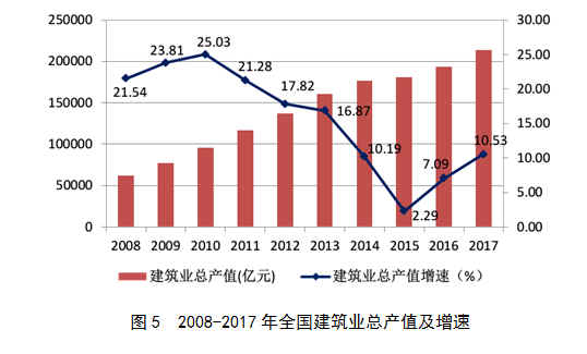 近年來,隨著我國建筑業(yè)企業(yè)生產(chǎn)和經(jīng)營規(guī)模的不斷擴大,建筑業(yè)總產(chǎn)值持續(xù)增長,2017年達到213953.96億元,比上年增長10.53%,增速比上年增加了3.44個百分點。建筑業(yè)總產(chǎn)值增速結(jié)束了2011年至2015年連續(xù)5年的下降趨勢,連續(xù)兩年出現(xiàn)增長(圖5)。