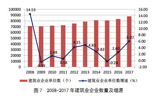 截至2017年底,全國共有建筑業(yè)企業(yè)88059個,比上年增加5042個,增速為6.07%,比上年增加了3.47個百分點,增速連續(xù)兩年增加(圖7)。國有及國有控股建筑業(yè)企業(yè)6800個,比上年減少14個,占建筑業(yè)企業(yè)總數(shù)的7.72%,比上年下降了0.49個百分點。