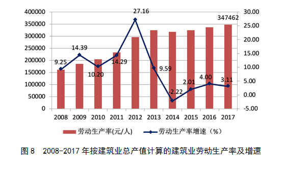 2017年,按建筑業(yè)總產(chǎn)值計算的勞動生產(chǎn)率為347462元/人,比上年增長3.11%,增速雖略有下降,但勞動生產(chǎn)率水平創(chuàng)出新高(圖8)。