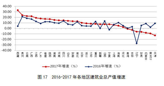 從各地區(qū)建筑業(yè)總產(chǎn)值增長情況看,有24個地區(qū)的建筑業(yè)總產(chǎn)值增長,20個地區(qū)的增速高于上年。西藏、貴州、云南和廣西分別以32.93%、24.12%、22.22%和22.06 %的增速位居前四位。7個地區(qū)的建筑業(yè)總產(chǎn)值出現(xiàn)負(fù)增長,其中,天津、黑龍江、內(nèi)蒙古出現(xiàn)了低于-8%的負(fù)增長,分別為-12.87%、-9.12%和-8.08%(圖17)。
