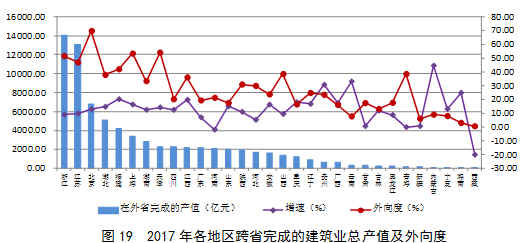 2017年,各地區(qū)跨省完成的建筑業(yè)產(chǎn)值74389.76億元,比上年增長11.94%,增速同比提高1.56個百分點。跨省完成建筑業(yè)產(chǎn)值占全國建筑業(yè)總產(chǎn)值的34.77%,比上年提高0.44個百分點。