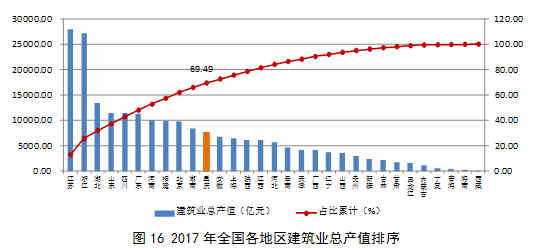 除蘇、浙兩省外,總產(chǎn)值超過7500億元的還有湖北、山東、四川、廣東、河南、福建、北京、湖南和重慶9個地區(qū),上述11省市完成的建筑業(yè)總產(chǎn)值占全國建筑業(yè)總產(chǎn)值的69.49%(圖16)。