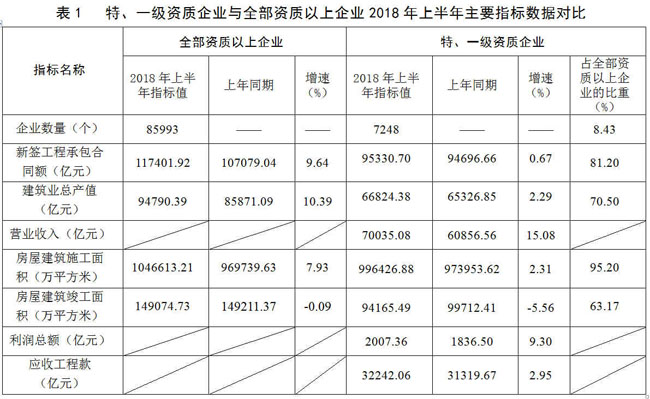 住房和城鄉(xiāng)建設部匯總的7248個特、一級資質建筑業(yè)企業(yè)2018年上半年主要指標數(shù)據(jù)如下(表1)。