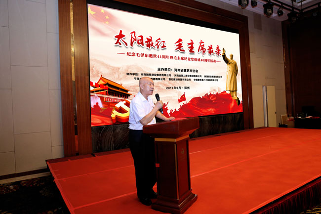 在9月9日偉大領(lǐng)袖毛主席逝世41周年之際,為寄托心中的哀思和表達(dá)對主席的敬仰,河南省建筑業(yè)協(xié)會舉辦了以“弘揚革命志•感念偉人懷”為主題的紀(jì)念活動。會議特別邀請到毛主席生前機要秘書張玉鳳夫婦、在河南期間的毛遠(yuǎn)新夫婦、中國建筑業(yè)協(xié)會吳濤副會長兼秘書長、中國工程院肖緒文院士、中國建筑工程總公司毛志兵總工程師,來自全國建筑業(yè)協(xié)會的負(fù)責(zé)人、建筑行業(yè)的嘉賓及我省建筑業(yè)企業(yè)家一起追憶、緬懷領(lǐng)袖!