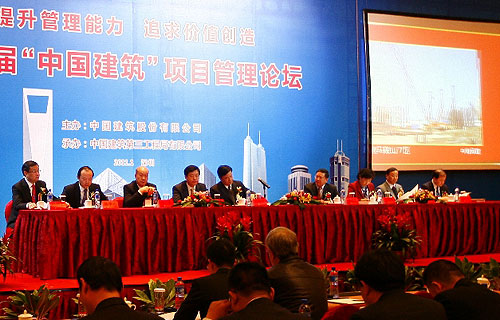 2011年1月6日至7日,由中國建筑股份有限公司組織的以“提升管理能力,追求價值創造”為主題的第二屆“中國建筑”項目管理論壇在深圳成功舉辦。中國建筑業協會副會長兼秘書長吳濤,中建總公司董事長、黨組書記易軍,深圳市委常委、常務副市長呂銳鋒,中建股份副總裁王祥明,深圳市住房和建設局副局長胡建文,英國皇家特許建造學會(CIOB)全球主席李世蓉等領導出席了論壇。中國建筑股份公司相關部門、各工程局有關負責人、部分優秀項目經理等近200人參加了論壇。