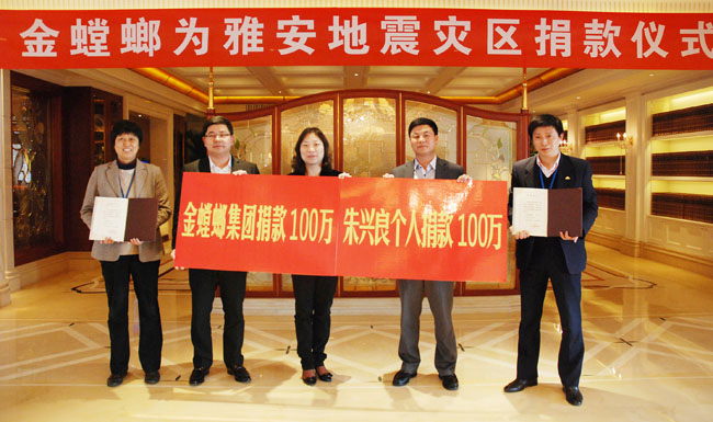 四川雅安地震發(fā)生后,金螳螂控股有限公司董事長(zhǎng)朱興良倡議集團(tuán)為災(zāi)區(qū)捐款。捐款儀式于4月23日舉行,金螳螂集團(tuán)共募捐200萬(wàn)元,其中朱興良個(gè)人捐款100萬(wàn)元。全部善款將通過(guò)蘇州工業(yè)園區(qū)慈善總會(huì)用于雅安地震災(zāi)區(qū)的恢復(fù)重建。