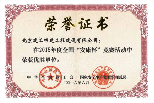 近日,由中華全國總工會、國家安全生產監(jiān)管管理總局聯(lián)合舉辦的2014-2015年度全國“安康杯”競賽落下帷幕,北京建工四建工程建設有限公司被授予2014-2015年度全國“安康杯”競賽優(yōu)勝單位榮譽稱號,系該公司歷史上首次獲此殊榮。
