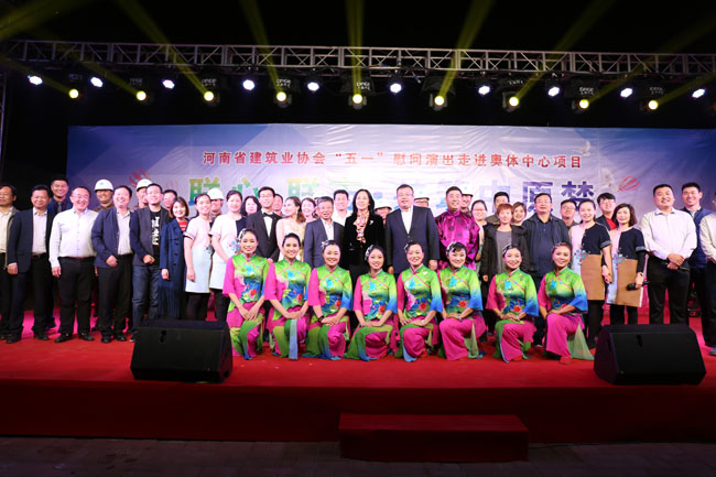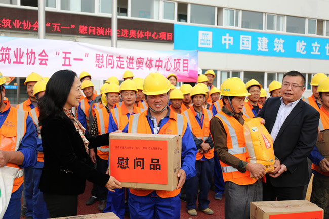 4月26日,“五一”國際勞動節即將來臨之際,河南省建筑業協會組織省內骨干企業走進河南省重點工程—— 鄭州市奧林匹克體育中心項目進行慰問,并為一線施工人員舉辦了以“聯心聯志•共筑中原夢”為主題的慰問演出。河南省住房和城鄉建設廳建設工會主任曹華凌、省建筑業協會常務副會長兼秘書長李娟、鄭州地產集團兼奧體中心指揮部副指揮長梁沈陽、中建八局鄭州辦事處主任楊愛來、中建八局二公司總工程師李忠衛以及骨干企業董事長、總經理齊聚活動現場,與奧體中心所屬參建單位代表、現場工友400余人一起觀看演出,歡度節日。
