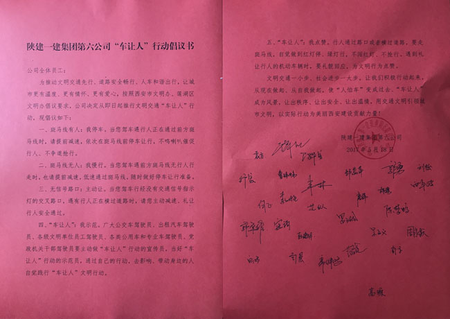 陜建一建集團第六公司作為市級文明單位,為進一步提升城市文明程度,讓城市更有溫度、更有情懷、更有愛心,按照西安市文明辦、蓮湖區文明辦倡議要求,公司決定從即日起推行文明交通“車讓人”行動,發起“車讓人”倡議活動,從公司機關領導帶頭做起,簽訂倡議書,承諾文明出行。