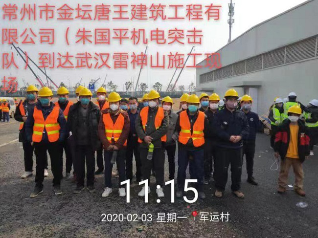 緊急馳援武漢雷神山醫院建設工程項目的28名唐王建筑工人,2月3日先后到達雷神山,經過當地體檢合格,全部投入雷神山沖刺決戰,與病毒搶時間,為金壇,為唐王爭光。在他們的馬甲上,都寫上“唐王”兩個字。他們每天加班加點突擊搶工,經常連續工作20小時,不喊苦,不喊累,心里想的就是盡快完成工作,盡快交付使用。在他們的努力下,最終提前兩天順利完成上級交予的任務。還未顧得上休息,他們又投入到協助其他兄弟隊伍完成任務的工作中去。