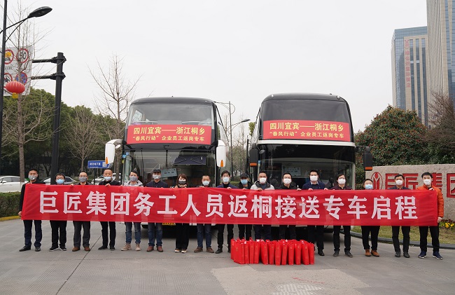 2月28日、29日兩天,6輛滿載巨匠人期盼的大巴車從桐鄉出發,分別開往四川宜賓、南溪,云南昭通,安徽六安、宿州等地。“巨匠號”返崗專車將接送140余位工友回桐返崗。