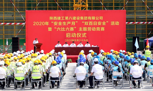 5月29日,陜建八建集團2020年“安全生產月”“雙百日安全”活動暨“六比六賽”主題勞動競賽啟動儀式在西安國際港務區新筑新城二期項目隆重舉行。集團黨委副書記、總經理王勛宣布啟動儀式。集團副總經理帖華作動員講話。集團生產管理部部長劉彥主持儀式。
