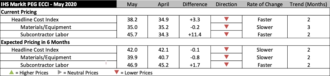 NEW YORK (May 27, 2020) – Engineering and Construction costs fell in May, according to IHS Markit (NYSE: INFO) and the Procurement Executives Group (PEG). The current headline IHS Markit PEG Engineering and Construction Cost Index registered 38.2 in May, a slight increase over last month’s figure of 34.9, but still well below the neutral mark of 50, indicating falling prices. The materials and equipment portion of the index came in at 35.0 with the sub-contractor portion at 45.7.