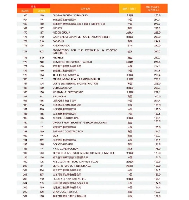 從中國企業來看,共有74家企業上榜,較上一年度減少1家,主要原因是部分企業實施了合并重組,由母公司統一參評。與2019年度相比,入圍今年“全球最大250家國際承包商”的74家中國企業中,有37家排名上升,其中上升幅度最大的為北京城建,排名從第154位上升至第105位,其次為安徽外經,排名從第166位上升至126位;27家企業排名下降;2家與2019年度排名持平;新上榜企業8家,分別是山東高速集團、龍建路橋股份有限公司、上海電氣集團股份有限公司、天元建設集團有限公司、湖南建工集團有限公司、江西省建工集團有限公司、南通四建集團有限公司、河北建設集團股份有限公司。在新上榜企業中,山東高速集團與龍建路橋表現較為亮眼,進入排名前150強,排名分別為第139位和第150位。