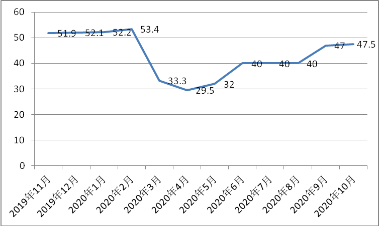 美國建筑師學(xué)會發(fā)布的建筑營業(yè)額指數(shù)(ABI)顯示了9到12個月之后的建筑支出,即新開工商業(yè)項目指數(shù),是衡量建筑業(yè)健康與否的一個指標(biāo),若數(shù)值超過50,則表明營業(yè)額增長。
